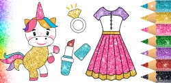 Glitter colouring pages for girls with a plenty of dress images and beauty products for girls.This glitter colouring application is full with dresses, unicorns, sunglasses, and beauty products that little girls love.